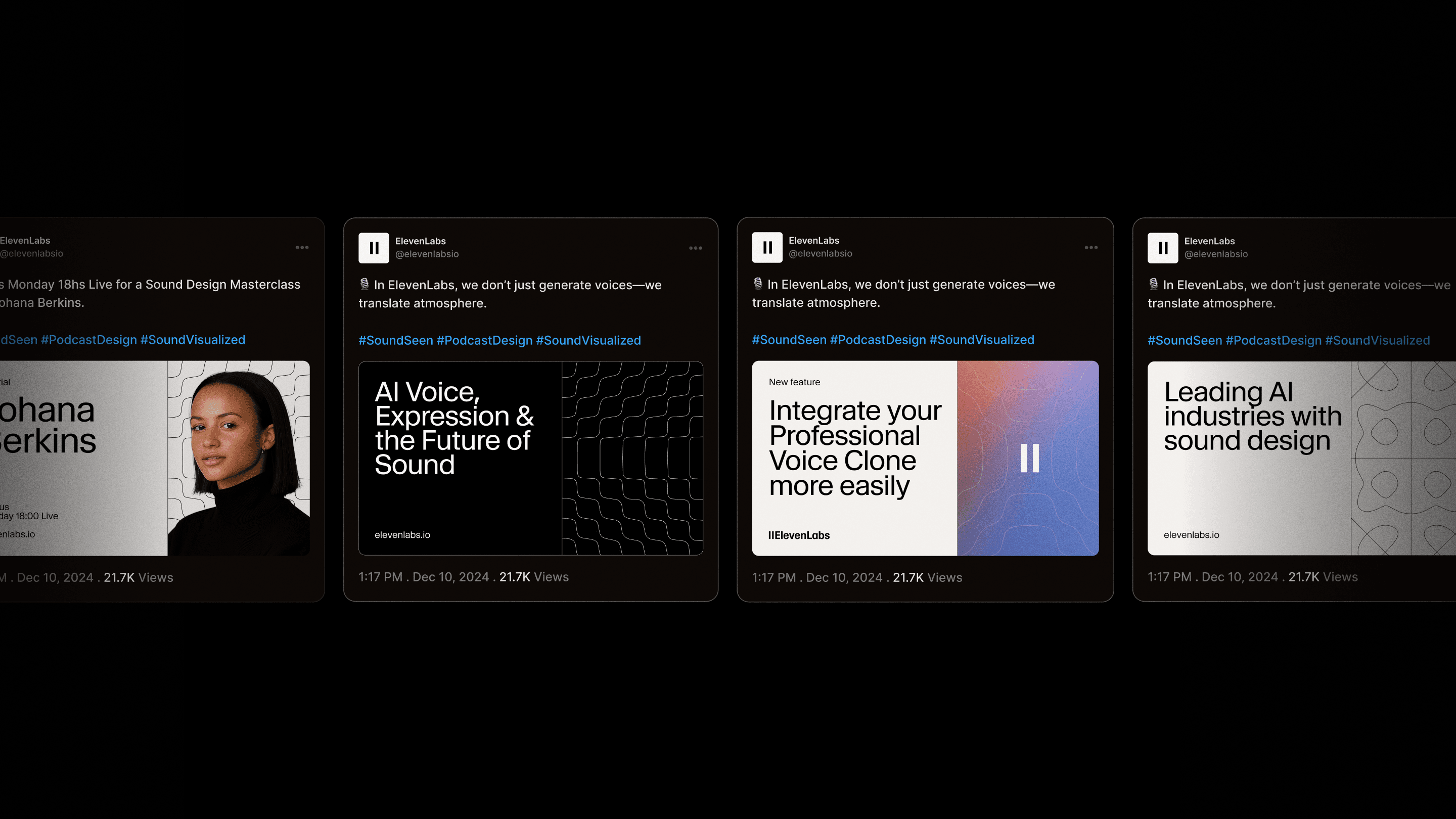That’s where basement came in. The logotype stayed, but everything else was rebuilt. Color, motion, composition. We turned fragments into a living system. Inspired by Chladni patterns, our team created a suite of sound-wave visuals layered with blur, designed to feel atmospheric and sensorial. We even built a custom generator that transformed complex math into a simple tool, letting ElevenLabs remix patterns and imagery on demand. Not just a rebrand, but a brand they could actually play with.
