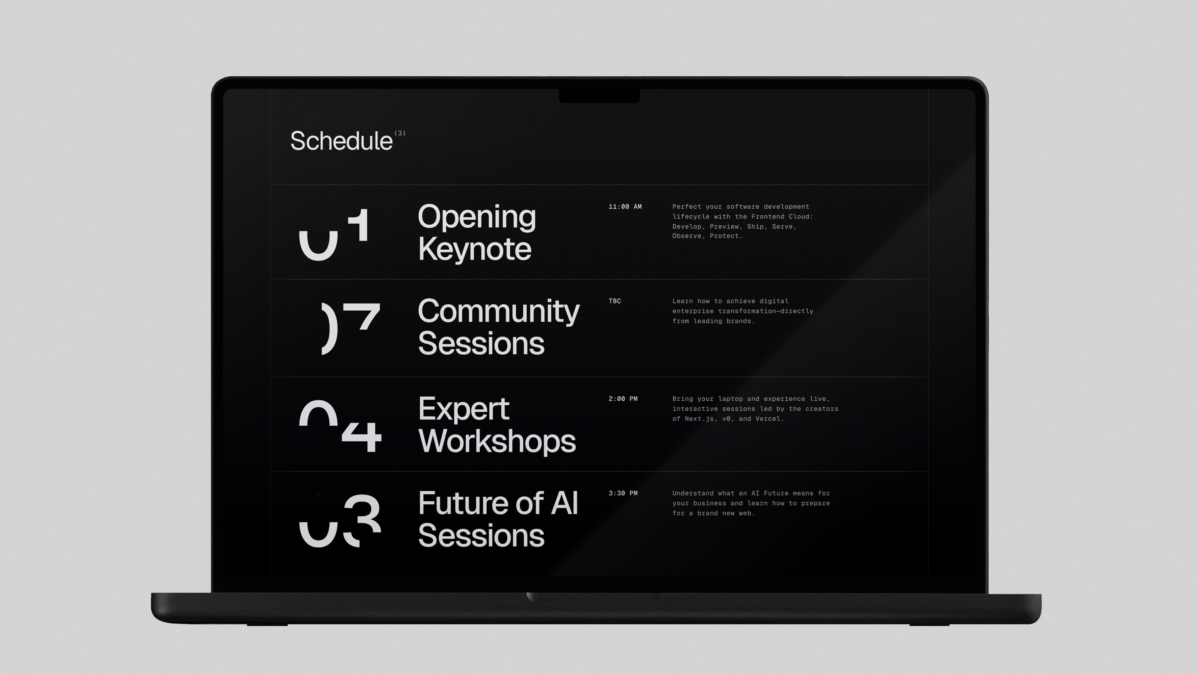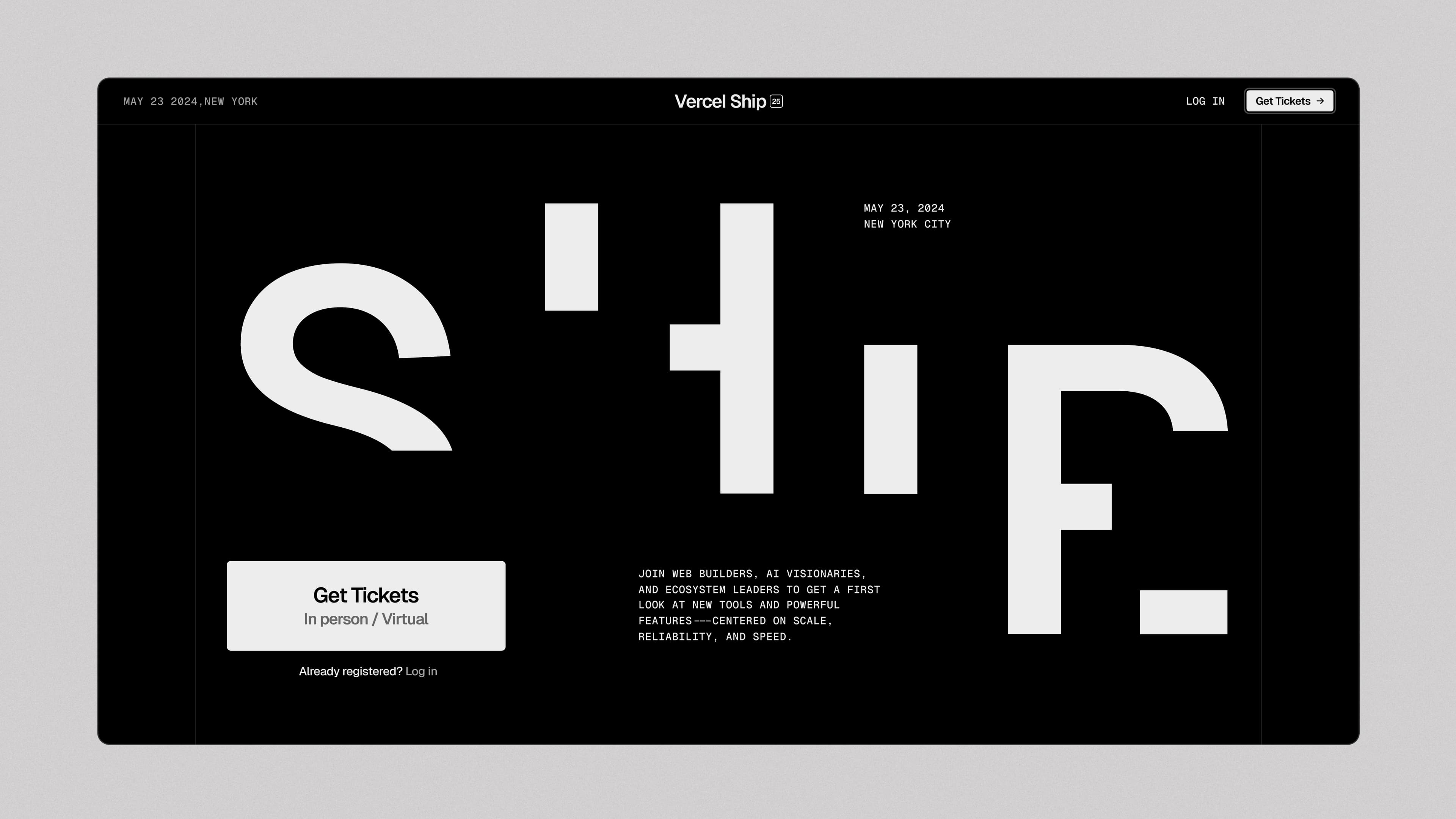 Teaming up with Vercel for the fifth time, we crafted a 360-degree experience that moved as fast as its audience. The website served as the entry point, streamlining subscriptions and setting the stage for what was to come. Beyond the screen, we collaborated on projection mapping, stage design, and creative direction to bring the event to life—supporting live demos, product reveals, and real-time engagement. From badges to posters and collaterals, every detail was designed to make Ship more than just an event—it was a fully immersive ecosystem.